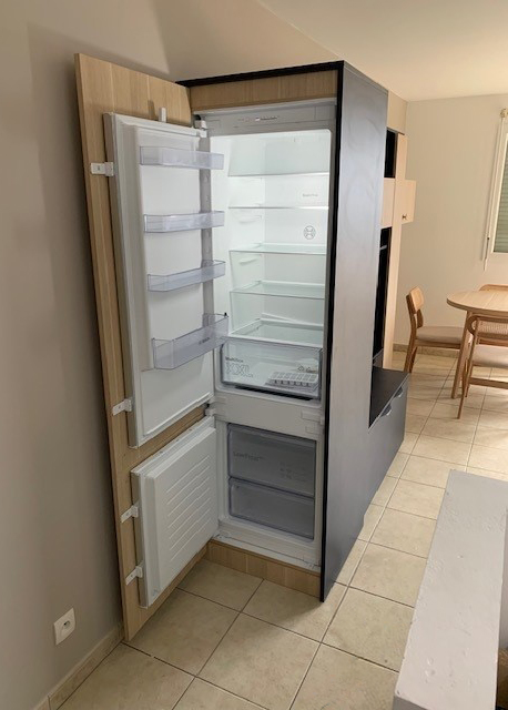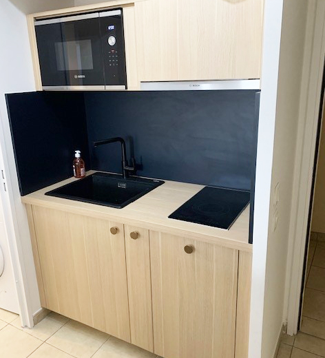 Dans cet aménagement d’appartement étudiant, la cuisine se veut compacte et bien pensée. Tout d’abord, elle intègre un petit lave-vaisselle, des plaques et un évier. Ensuite, nous associons le bois naturel à des éléments noirs pour créer du contraste. Par ailleurs, la crédence bleu marine et les poignées en laiton apportent une touche élégante. Ainsi, l’ensemble reste moderne et harmonieux. Enfin, un grand réfrigérateur s’intègre dans le meuble du salon pour optimiser l’espace.