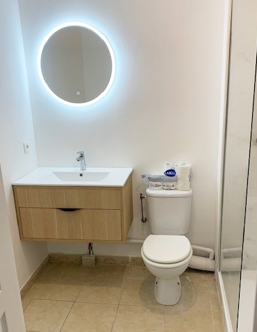 La salle de bain s’intègre parfaitement dans cet aménagement de l’appartement étudiant. Tout d’abord, nous installons un meuble suspendu pour faciliter le nettoyage. Ensuite, un grand tiroir permet un rangement efficace. De plus, le bois et la résine assurent durabilité et facilité d’entretien. Enfin, un miroir rétroéclairé apporte une touche moderne.