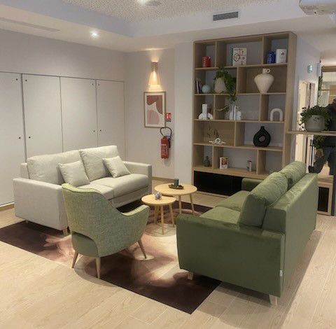 Dans les espaces communs, nous avons privilégié des ambiances douces et accueillantes. Les assises sont confortables. Les tissus sont adaptés à un usage intensif. Les tables et rangements sur mesure utilisent des matériaux durables et faciles à entretenir. Par ailleurs, chaque détail décoratif favorise les échanges et la vie sociale, tout en créant un environnement chaleureux et sécurisé.