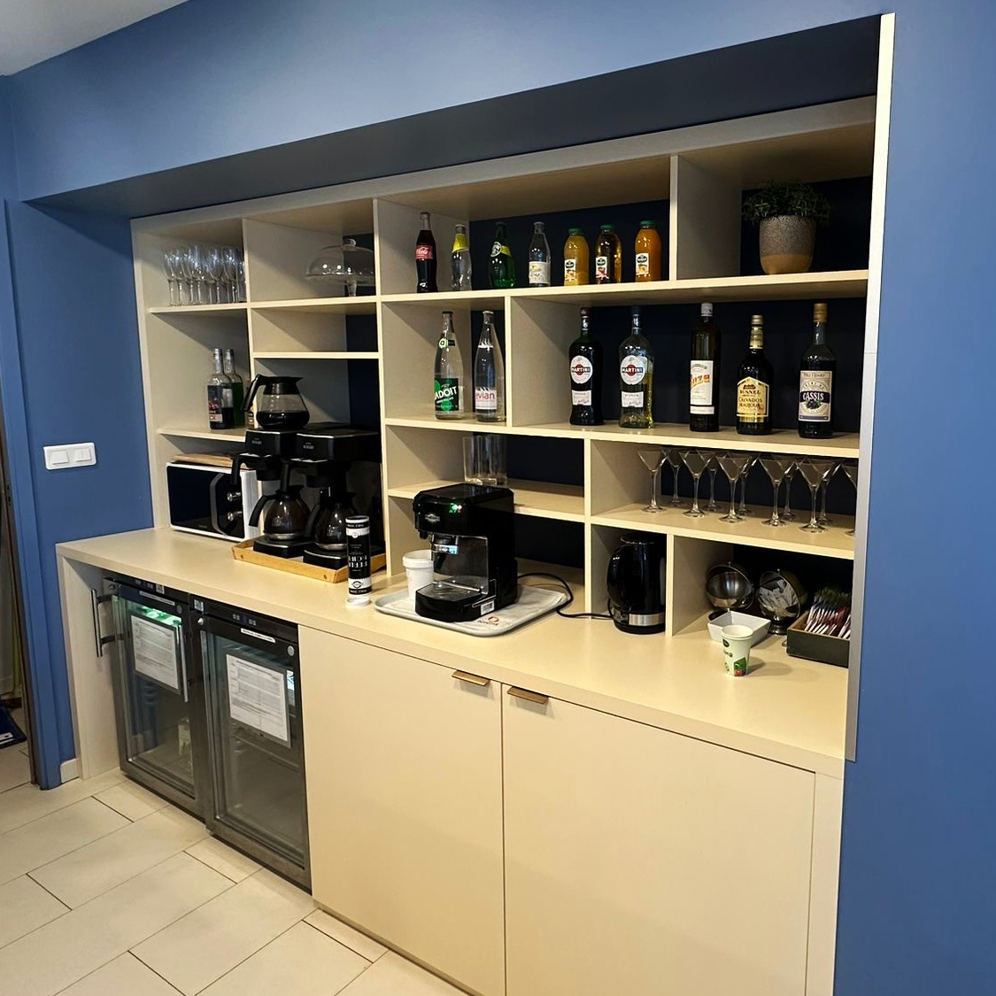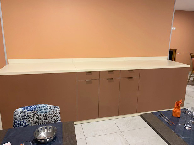 Dans le restaurant, nous avons conçu un meuble bas sur mesure.