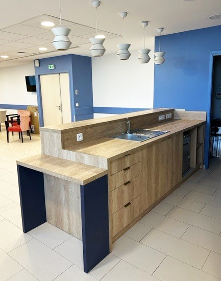 Chaque poste intègre un tiroir de rangement et un miroir individuel. Ainsi, l’espace devient plus fonctionnel et plus confortable, aussi bien pour les résidents que pour les professionnels.