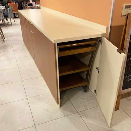 Concrètement, il permet le rangement des deux chariots de service sur les côtés, tout en intégrant une partie centrale dédiée au stockage.